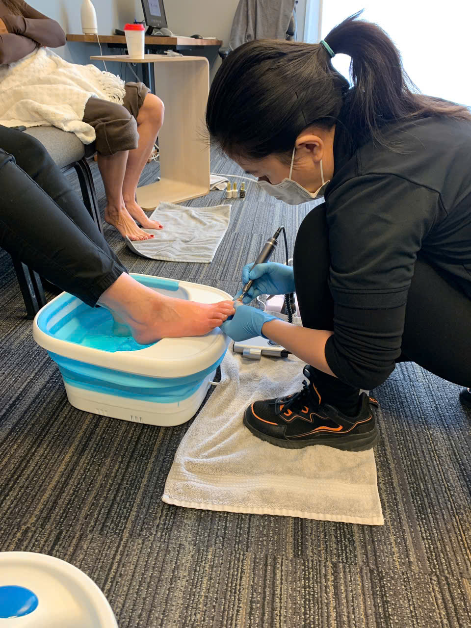 You choose a plan, receive a monthly code, and schedule your visits. Our technician arrives at your home in Edmonton and provides gentle manicure & pedicure care.